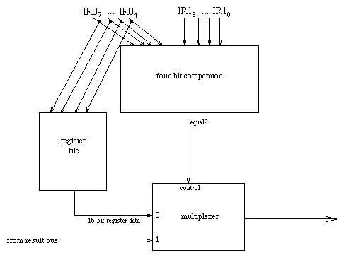 Inputs are the result bus (16 bits), bits 7 through 4 of IR0, and bits 3 through 0 of IR1. The circuit also consults the register file.