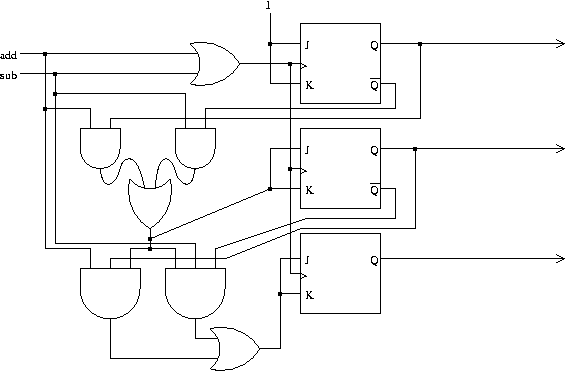 add 7 (which is the same as subtracting 1, in three bits) if 'sub' is 1.