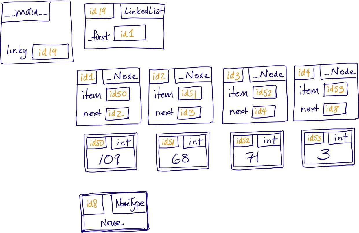 For example, the following is a diagram showing a linked list named linky with four elements, in order 109, 68, 71, 3.